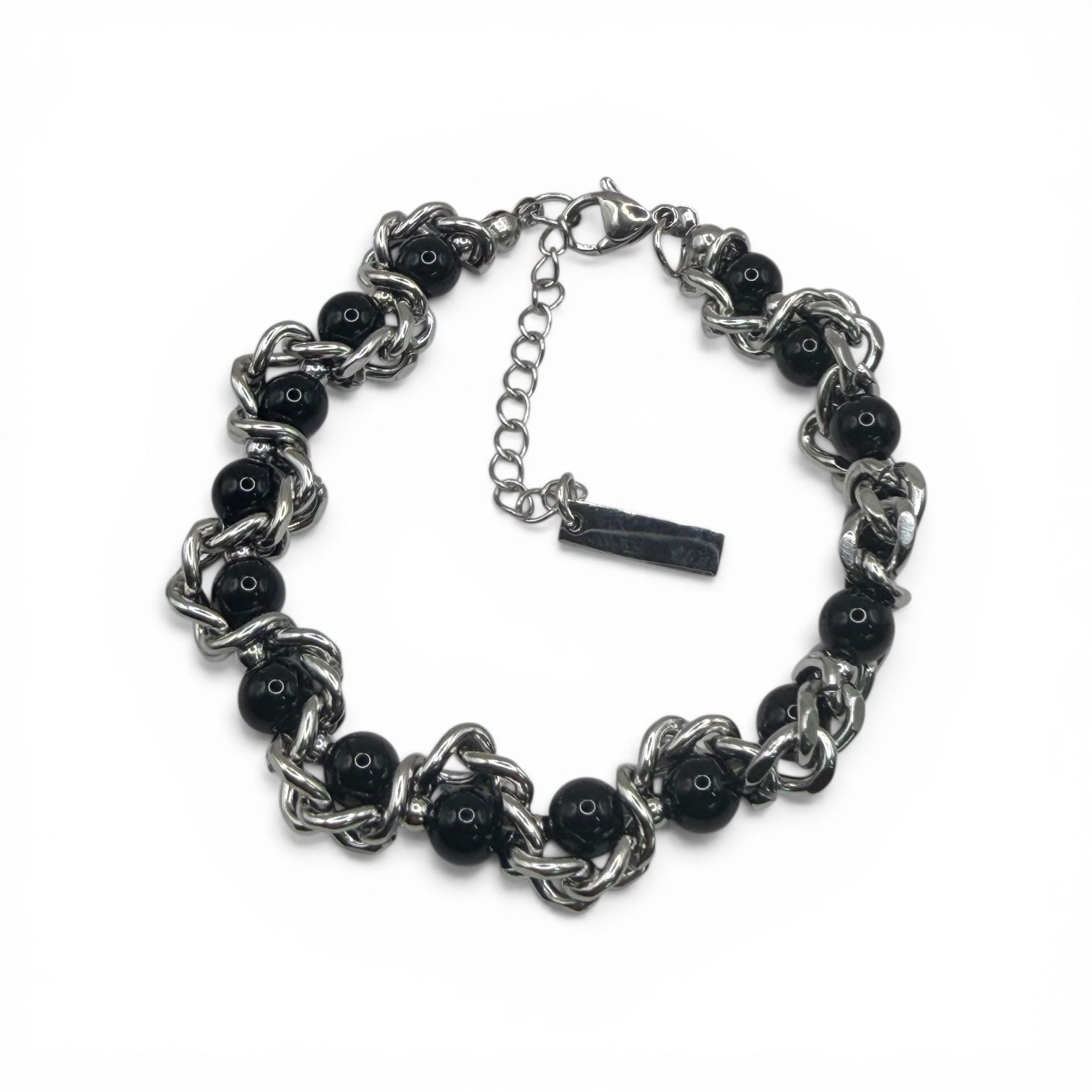 Featuring deep, jet-black onyx-style beads intricately woven into a heavy-duty stainless steel double-link chain, this piece offers a rugged yet refined aesthetic. The high-shine silver finish of the steel perfectly complements the matte-like depth of the stones, making it versatile enough for a tailored suit or your favorite worn-in leather jacket.